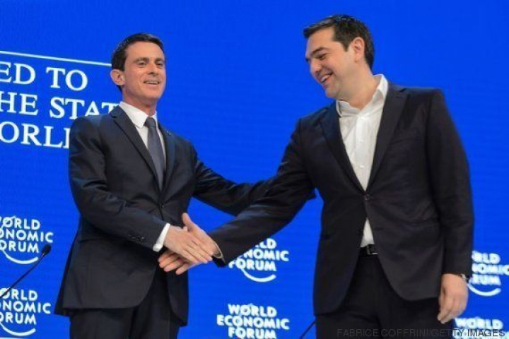 ¿Un aliado contra el FMI? El primer ministro francés, Manuel Valls, saluda a su homólogo griego, Alexis Tsipras, en el Foro Económico Internacional de Davos (Suiza).