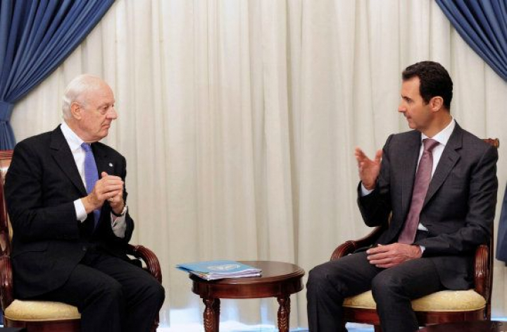 El presidente sirio, Bachar el Asad, en una audiencia en Damasco con el enviado especial de la ONU para el país, Staffan de Mistura.