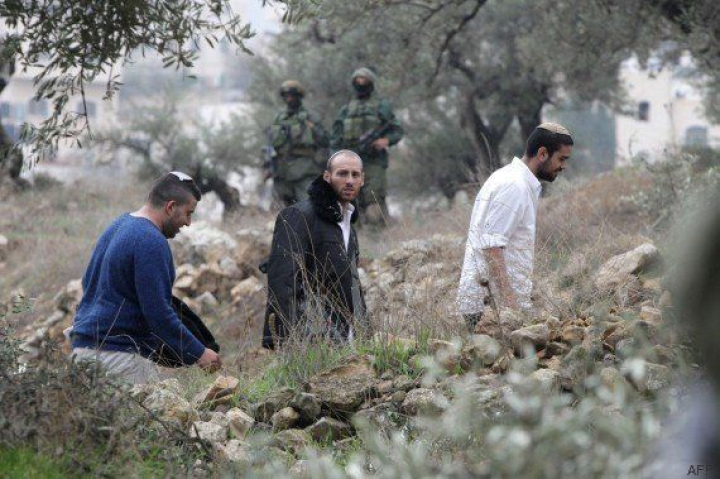 Colonos que residen ilegalmente en Hebrón (Cisjordania), escoltados por soldados de Israel.
