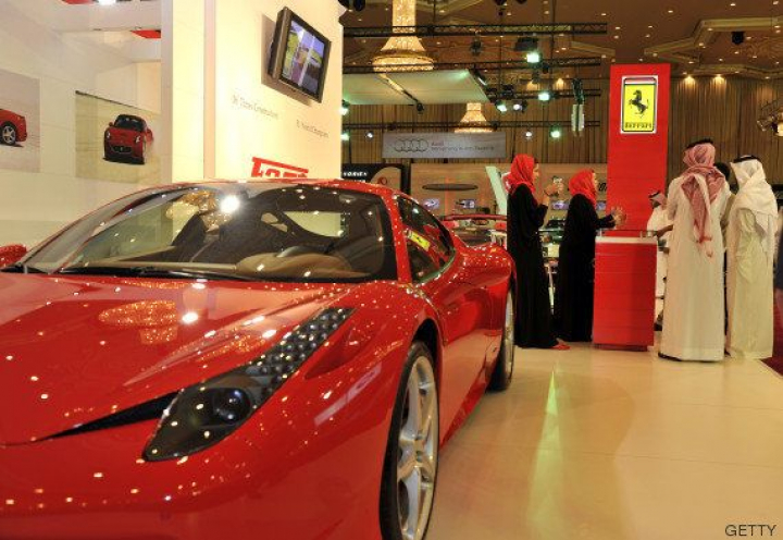Compradores saudíes se interesan por coches de Ferrari en una feria de motor.