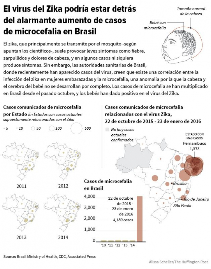 Entre 2010 y 2014, Brasil registró una media de 156 bebés al año nacidos con microcefalia. No obstante, de octubre de 2015 a enero de 2016, la cifra se disparó hasta los casi 4.000 bebés. Los investigadores sospechan que esos niños pudieron haberse infectado del virus cuando estaban en el útero de su madre, y que el virus pudo haber afectado a su desarrollo.