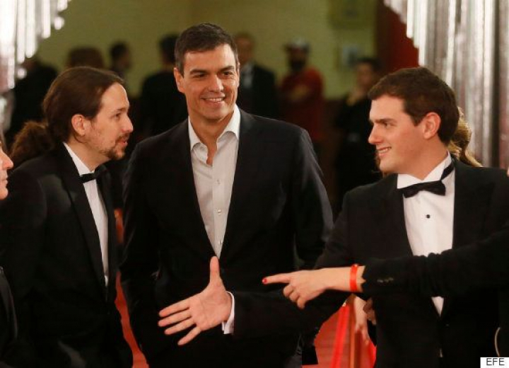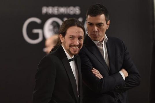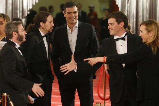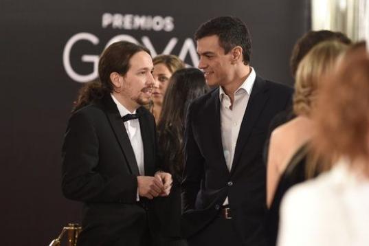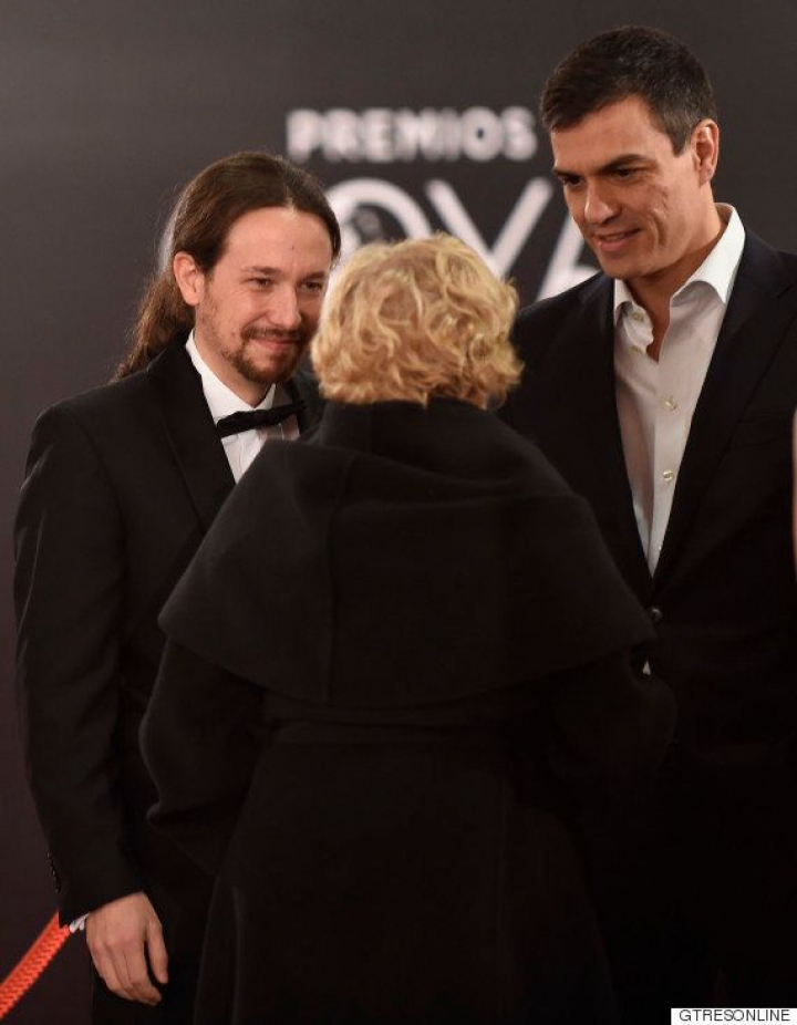 Tras pisar la alfombra roja, Pablo Iglesias se tomó esta fotografía con el secretario general del PSOE, Pedro Sánchez, quien iba con una americana, camisa blanca y sin corbata.