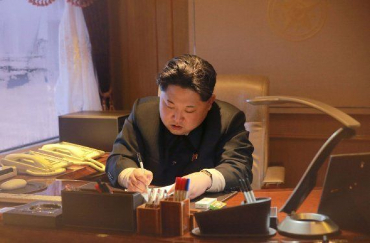 Kim Jong-Un, firmando el decreto por el que permitía el lanzamiento.
