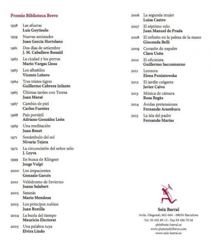 El premio Biblioteca Breve amplia esta lista de galardones a la vez que su nombre se suma al de galardonados, con nombres como Mario Vargas Llosa, Juan Marsé o Fernando Marías en 2015.