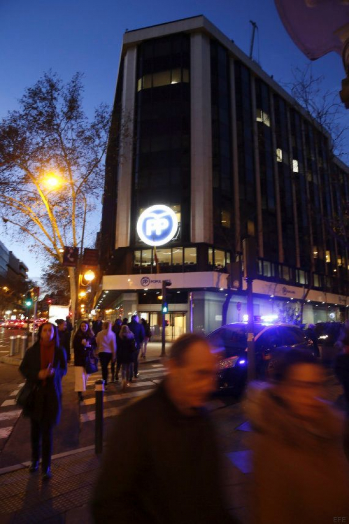La sede del PP en Madrid, durante el registro de la Guardia Civil.