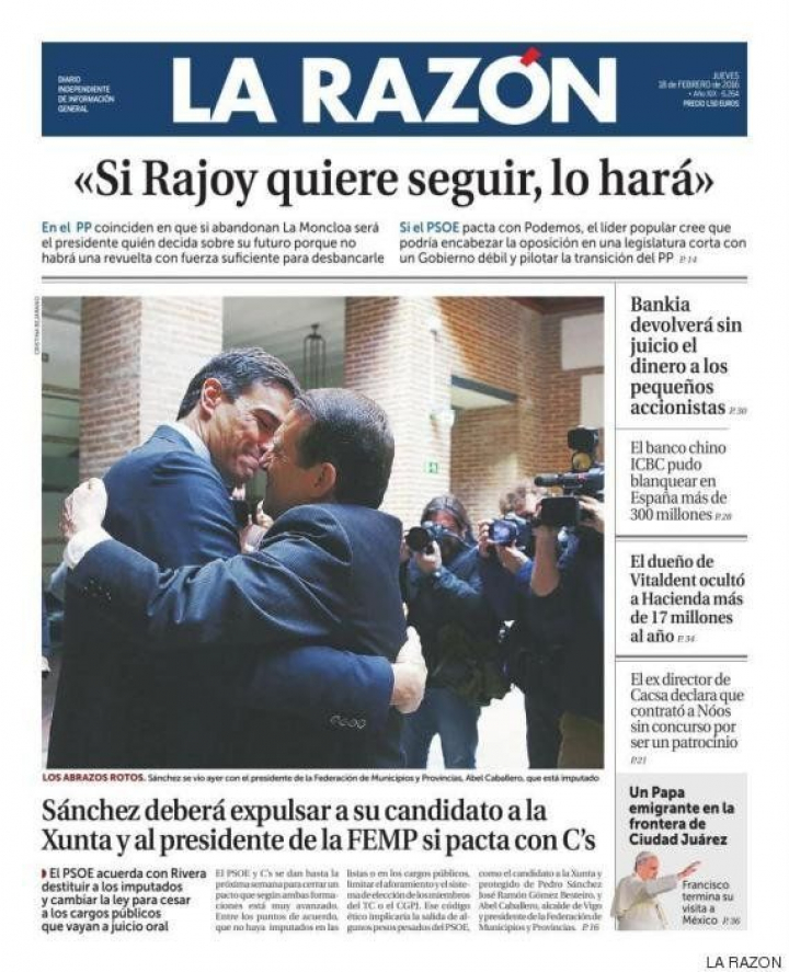 "Siempre con la libertad" es el título de un extenso artículo de opinión que el Presidente del Gobierno en funciones firma en El País con motivo del segundo aniversario del encarcelamiento del líder opositor venezolano Leopoldo López. Pero Rajoy no desaprovecha la ocasión para arremeter contra un pacto entre PSOE y Podemos. De manera retórica se pregunta: "¿Podemos tener un autoproclamado candidato a vicepresidente de Gobierno que no condenó la represión... de la oposición en Venezuela? ¿Puede plantearse el PSOE pactar con quien, cuando era eurodiputado, votó en contra de la petición de excarcelación de López?... Y concluye: "La política exterior de un demócrata antepone los valores a los intereses". Según anuncia La Razón en su apertura, "si el PSOE pacta con Podemos, el líder popular cree que podría encabezar la oposición una legislatura contra con un Gobierno débil y pilotar la transición del PP".