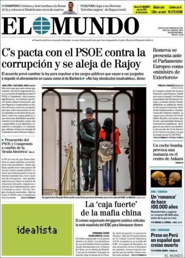 En corrupción, por ejemplo. Y "se aleja de Rajoy" a juicio de El Mundo porque el acuerdo "prevé cambiar la ley para expulsar a los cargos públicos que vayan a ser juzgados e impedir el aforamiento en casos como el de Barberá". Y otros. El País insiste esta mañana en que el juez Eloy Velasco "sospecha que el Canal de Isabel II sirvió para alimentar la caja b" de los populares madrileños. El lunes preguntó a un adjudicatario: "¿Financió usted irregularmente al PP de Madrid?".