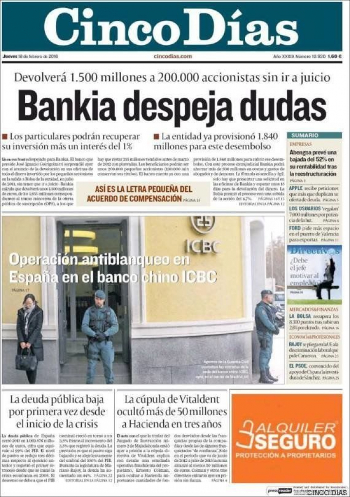 Hay práctica unanimidad en los diarios a la hora de evaluar esta decisión como una salida razonable para la entidad. Para Cinco Días es "una solución para encarar el futuro". Para los minoritarios, señala El País, se plantean dos dudas a evaluar: el bajo interés que les ofrece la entidad por el tiempo transcurrido -el 1% cuando debería ser el 3- y la liquidación de las costas por los trámites legales iniciados. El Mundo cree que sólo queda esperar que por la vía penal se depuren responsabilidades.