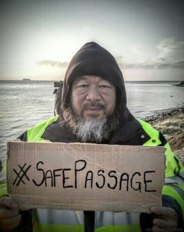 El artista chino Ai Weiwei, mostrando desde Lesbos (Grecia) el lema de la campaña en redes sociales.