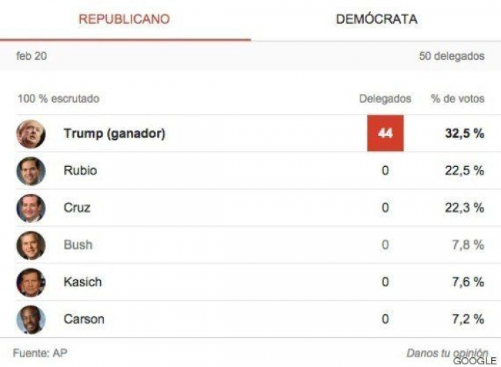 Con el escrutinio realizado al 99 %, Trump venció con holgura (32,5 % de los votos) seguido del senador de origen cubano por Florida Marco Rubio (22,5 %) y el también senador de ascendencia cubana por Texas Ted Cruz (22,3 %).