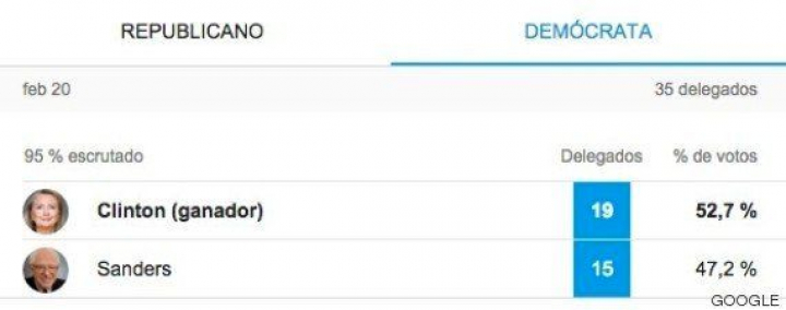 En la contienda demócrata en Nevada, y con el 89 % del escrutinio realizado, Clinton obtuvo el triunfo tras recibir el 52,6 % de apoyo frente al 47,3 % que respaldó al senador por Vermont Bernie Sanders.