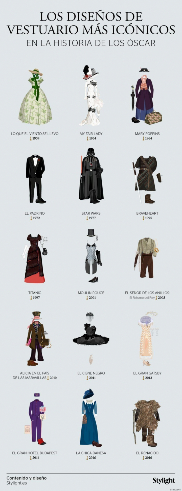 La lista de vestidos icónicos de la infografía incorpora dos de los cinco trabajos este año. Uno es el vestido de piel de oso que lució Leonardo DiCaprio en El renacido, película por la que parte como gran favorito para ganar el Oscar. De conseguirlo, podría decirse que algo de culpa la tiene la diseñadora Jacqueline West, encargada del vestuario de la película y de otras cintas como Argo o El curioso caso de Benjamin Button. Pero si hay una reina indiscutible en este terreno, esa es la antes nombrada Edith Head, que ha conseguido 35 nominaciones y 8 premios.