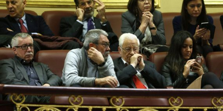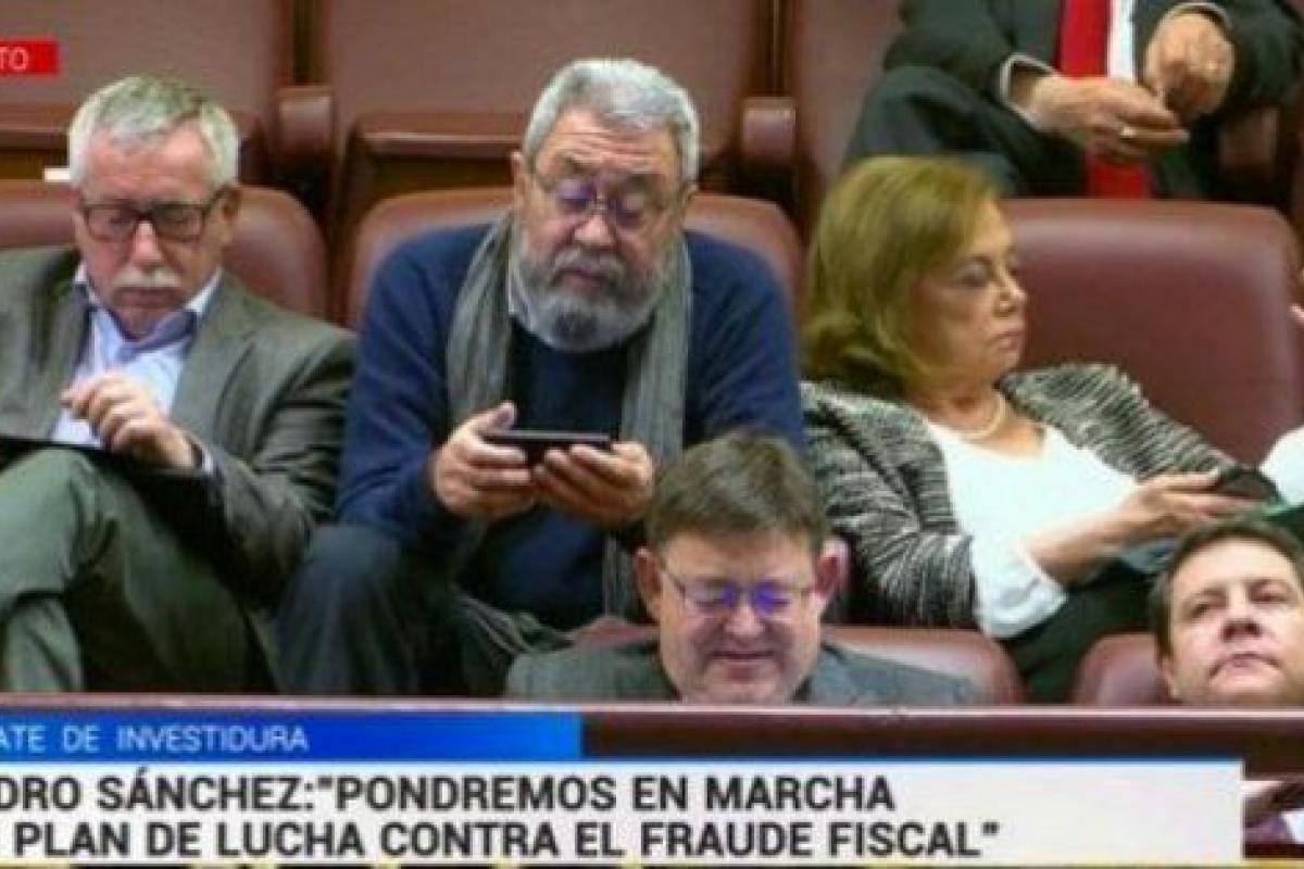 La instantánea de los líderes sindicales junto a Emiliano García Page, Ximo Puig y Amparo Rubiales aburridos en la tribuna de invitados durante el discurso de investidura de Pedro Sánchez y utilizando su móviles, ha corrido como la pólvora por las redes sociales, generó un aluvión de críticas en las redes sociales.