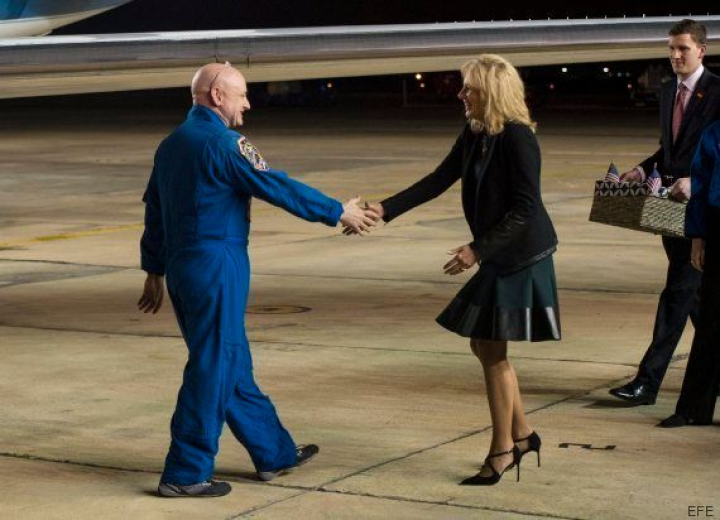 Procedente de Kazajistán, Kelly llegó a la ciudad texana poco después de la 1.15 hora local (7.45 GMT), donde se reunió con sus hijas, su pareja y su hermano gemelo, entre otros, tras un año en el espacio. Su comisión de bienvenida la encabezaba la esposa del vicepresidente de Estados Unidos, Jill Biden, a la que pidió disculpas, con humor, por el retraso de casi tres horas sobre el horario previsto "Estaba acostumbrado a ir a 17.500 millas (unos 28.000 kilómetros) por hora pero este avión no va tan rápido".