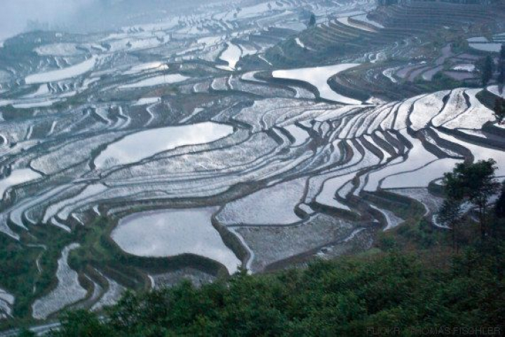 Puede parecer un cuadro abstracto, pero no, se trata de los campos de arroz de Yuanyang, en china. Aunque sea una estampa muy natural, tienen este aspecto gracias a las continuas modificaciones de los Hani. Foto:Thomas Fischler.