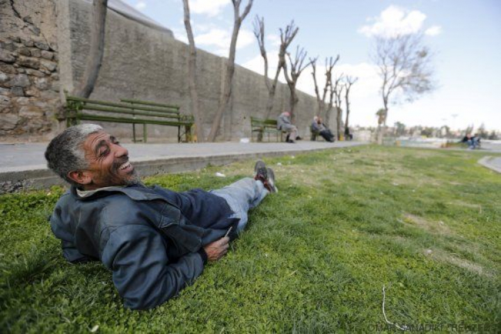 Un sirio sonríe, tumbado al aire libre, aprovechando la extraña calma en Jobar, un suburbio de Damasco.