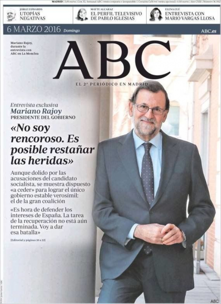 En una entrevista concedida al diario ABC, Rajoy señala que "nadie está en condiciones de aplicar la totalidad de su programa y sus convicciones. Ni con votos ni sin ellos".