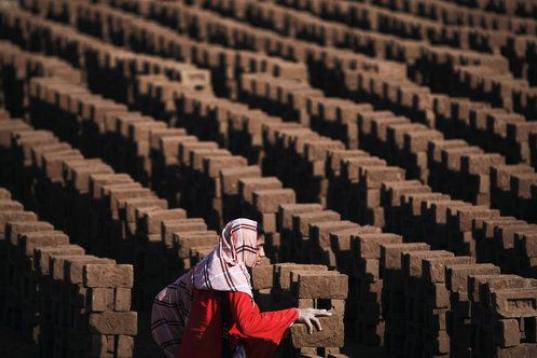 Una mujer pakistaní arregla ladrillos mientras trabaja en una fábrica en las orillas de Islamabad, Pakistán, el lunes 8 de marzo de 2010. (Muhammed Muheisen/AP)