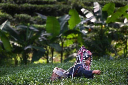 Una mujer Akha Hilltribe recoge hojas de té durante una cosecha en la granja Suwirun en las colinas de las afueras de Chiang Rai el 11 de noviembre de 2012 en Tailandia. (Paula Bronstein/Getty Images)