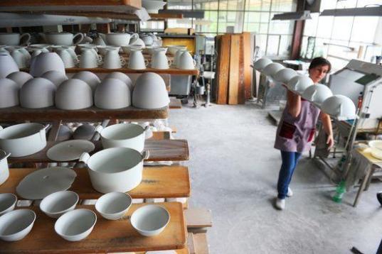 Una mujer trabaja en una planta de fabricación de porcelana cerca de Limoges, Francia, el 5 de julio de 2013. (MEHDI FEDOUACH/AFP/Getty Images)