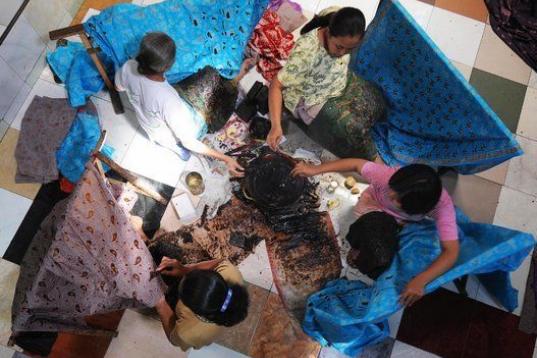 Artesanas Batik aplican cera derretida a los textiles finos de algodón para producir diseños de figuras en un taller en la ciudad de Solo, en Java Central, Indonesia, el 29 de junio de 2009. (ROMEO GACAD/AFP/Getty Images)