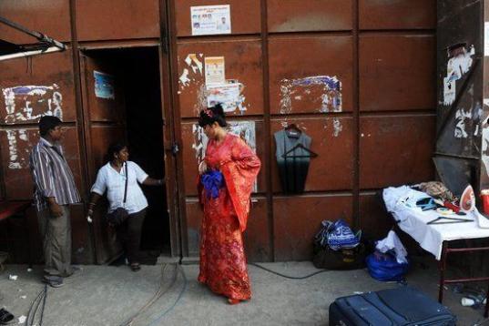 La actriz india Vemi Rephung de Nagaland se toma un descanso durante el rodaje de una secuencia de la película de Bollywood, "Go Goa Gone", en Filmcity en Bombay el 8 de abril de 2013. (INDRANIL MUKHERJEE/AFP/Getty Images)