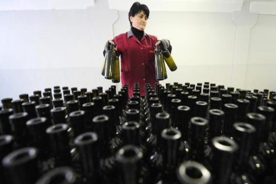 Una empleada detrás de unas botellas en una bodega de vinos en Tbilisi el 11 de febrero de 2013. (VANO SHLAMOV/AFP/Getty Images)