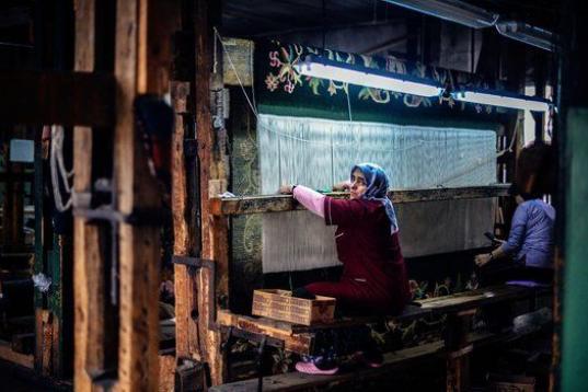 Esta foto tomada el 22 de enero de 2014, muestra a mujeres que trabajan en una alfombra en una pequeña fábrica en Kostandovo, un pequeño pueblo en las montañas Ródope al sur de Bulgaria. (DIMITAR DILKOFF/AFP/Getty Images)