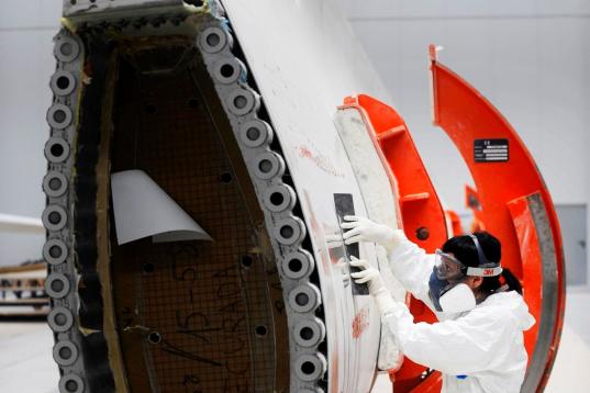 Una foto tomada el 8 de julio de 2013 muestra a una mujer que trabaja en una turbina de viento en una planta de Gamesa en la localidad española del Norte de la provincia de Aoiz, Navarra. (RAFA RIVAS/AFP/Getty Images)