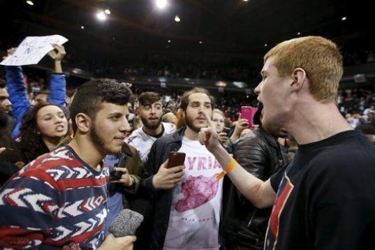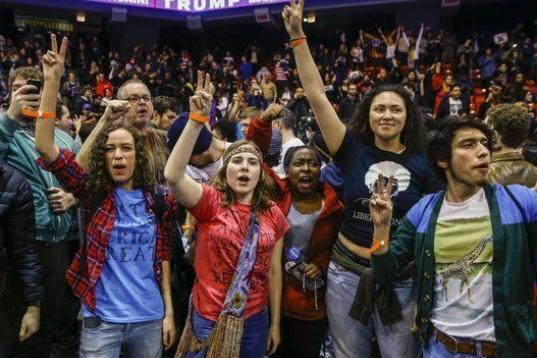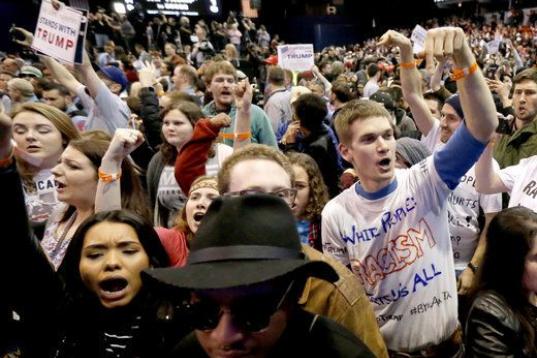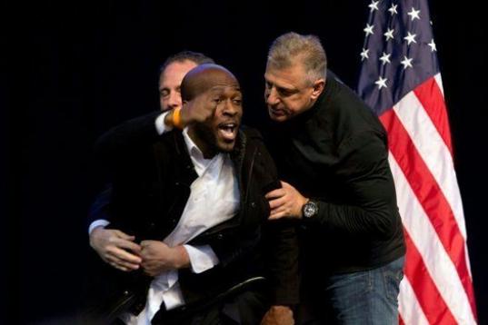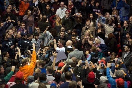 Mientras una gran concentración de gente rodeaba el recinto, dentro de él los manifestantes gritaban "Que le den a Trump" y "¡Bernie, Bernie!", en referencia al aspirante del bando demócrata Bernie Sanders. Uno de los manifestantes llegó a subirse al atril desde el que tenía que hablar Trump, ante lo que los responsables de seguridad trataron de reducirle y bajarle del estrado.