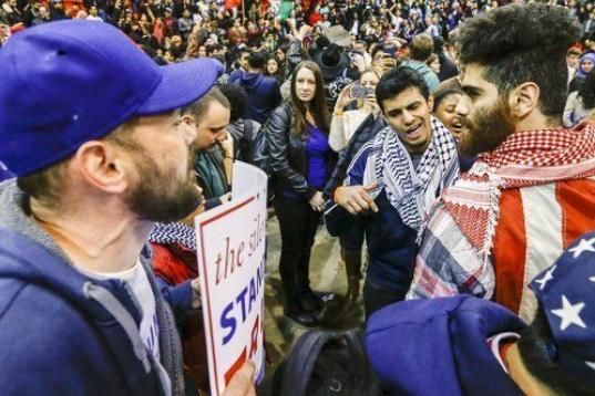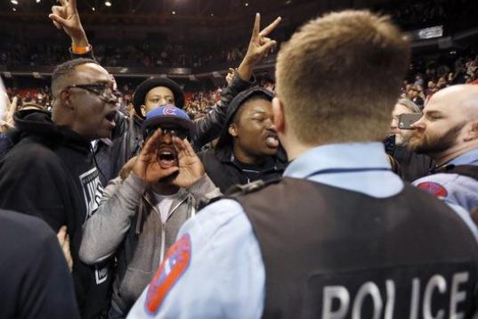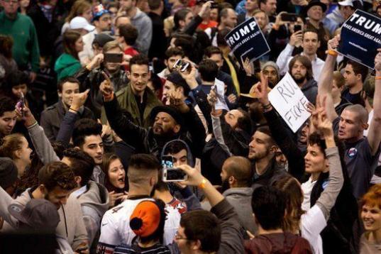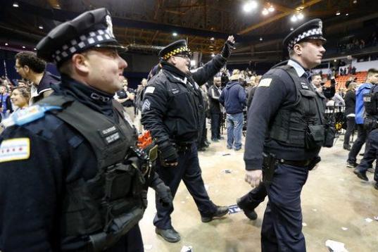 Las cámaras de televisión de los principales canales del país mostraron imágenes de enfrentamientos violentos entre detractores y partidarios del candidato tanto dentro del Pabellón Chicago de la Universidad de Illinois (donde iba a celebrarse el evento), como fuera del local.