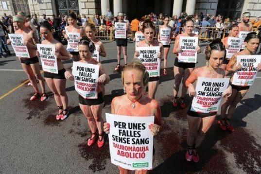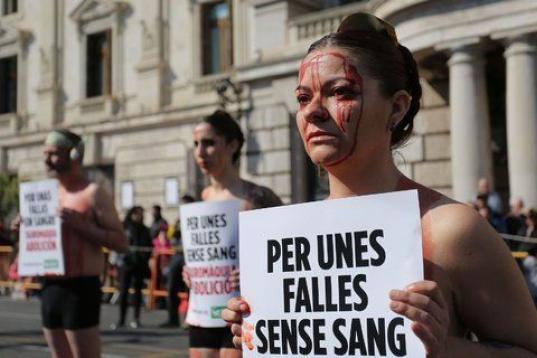 En la misma jornada, una veintena de activistas antitaurinos 'ensangrentados' y ataviados con peinetas, moños y 'espardenyes' típicos de Fallas han protestado contra las cerca de 100 muertes de toros y becerros que se producen durante estas fiestas, en una performance frente al Ayuntamiento de Valencia organizada por AnimaNaturalis.