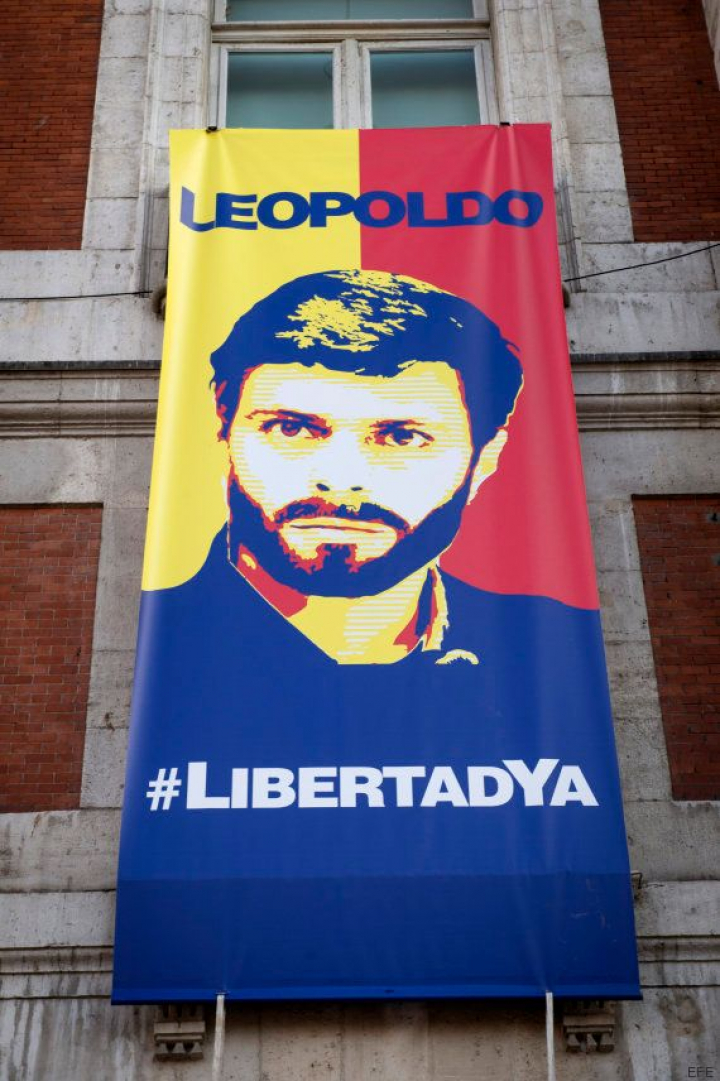 Cifuentes cuelga en Sol dos carteles en apoyo al opositor venezolano Leopoldo López bajo el lema 'Libertad ya'