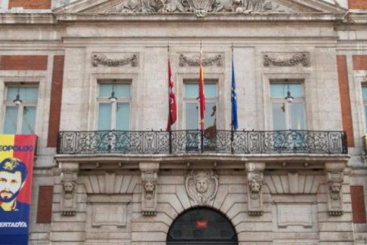 La fachada de la Real Casa de Correos, sede del Gobierno de la Comunidad de Madrid, ha amanecido este lunes con dos carteles en apoyo al opositor venezolano Leopoldo López, con la imagen del preso y el lema "Libertad ya".