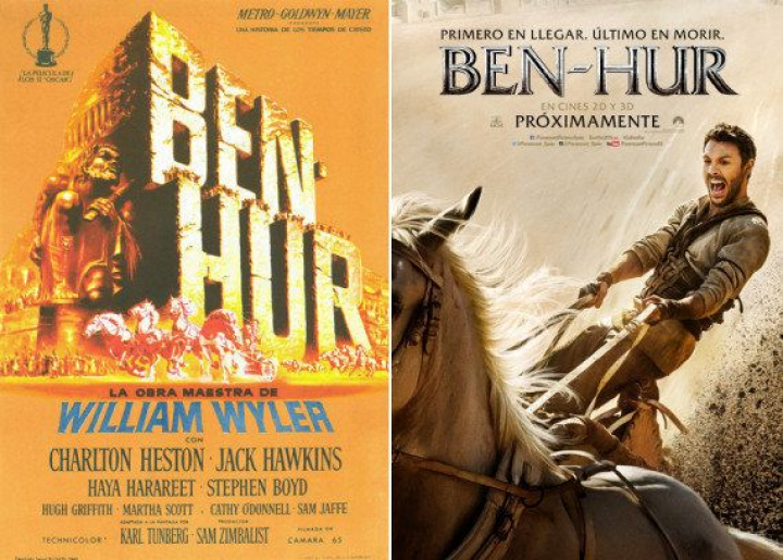 La imagen de la cuadriga es la misma que sea ha utilizado para el primer cartel de la película y que poco tiene que ver con el clásico de 1959. Si en esta el protagonismo lo acapara Huston, en la versión anterior lo tenían las enormes letras doradas diseñadas por Reynold Brown. Dos estilos muy diferentes para una misma historia, la de la enemistad del príncipe Judá Ben-Hur y Mesala, un tribuno romano que dirige los ejércitos de la ocupación y que antes fueron amigos.