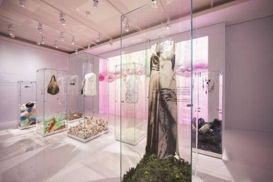 Una de las salas del Museo de Artes Decorativas con algunas de las prendas de la Conscious Exclusive Collection; bajo ellas, los materiales con los que han sido fabricados: el vestido a base de fibra de cáñamo, la camisa con algodón orgánico, el bolso con botellas PET, las gafas de sol con bolsas de plástico, los pendientes con 'denim'… [Pincha para ampliar la foto]
