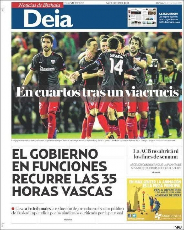 "El gobierno en funciones lleva a los tribunales la reducción a 35 horas de la jornada en el sector público en Euskadi, aplaudida por los sindicatos y criticada por la patronal", parece quejarse en primera el nacionalista Deia. Al tiempo que Montoro anuncia que adelantará 350 de los 1.000 millones que reclama Junqueras, el presidente Puigdemont concede un entrevista al Financial Times en la que reafirma que "Madrid no tiene que aprobar la secesión de España" y asegura que no quieren "sacar partido de la inestabilidad política que vive España".