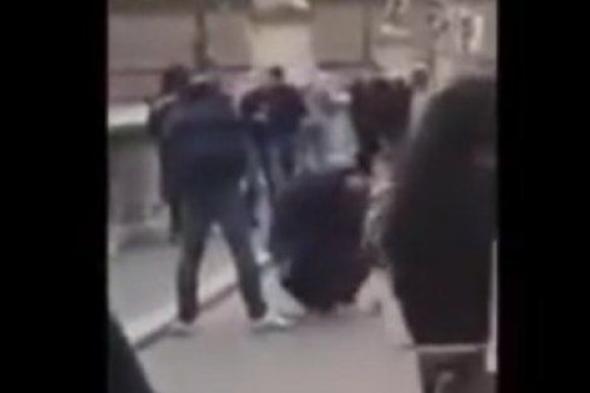 En el vídeo que grabó se puede ver cómo dos aficionados del club checo se acercan a una mujer que se encuentra arrodillada en el suelo pidiendo y comienzan a orinar sobre ella.