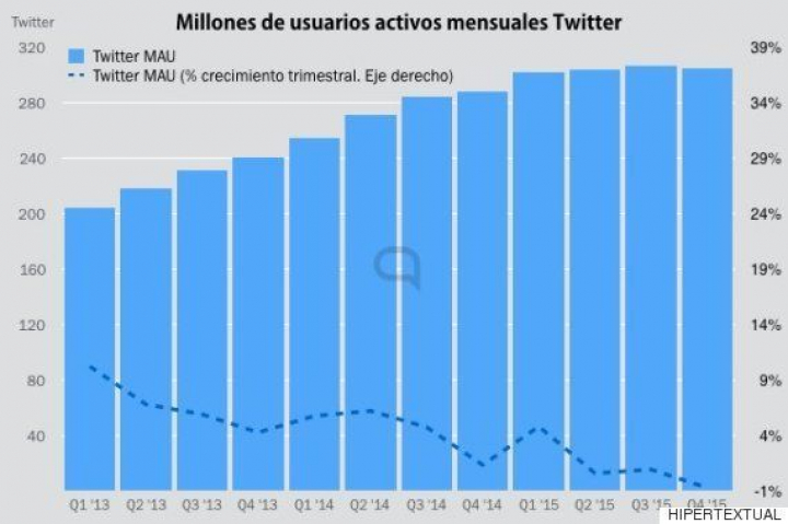 Se esperaba que Twitter cerrara 2015 con 325 millones de usuarios, pero se quedó en los 320 millones. Puedes ver la evolución de los usuarios y el crecimiento trimestral en este gráfico de Hipertextual: