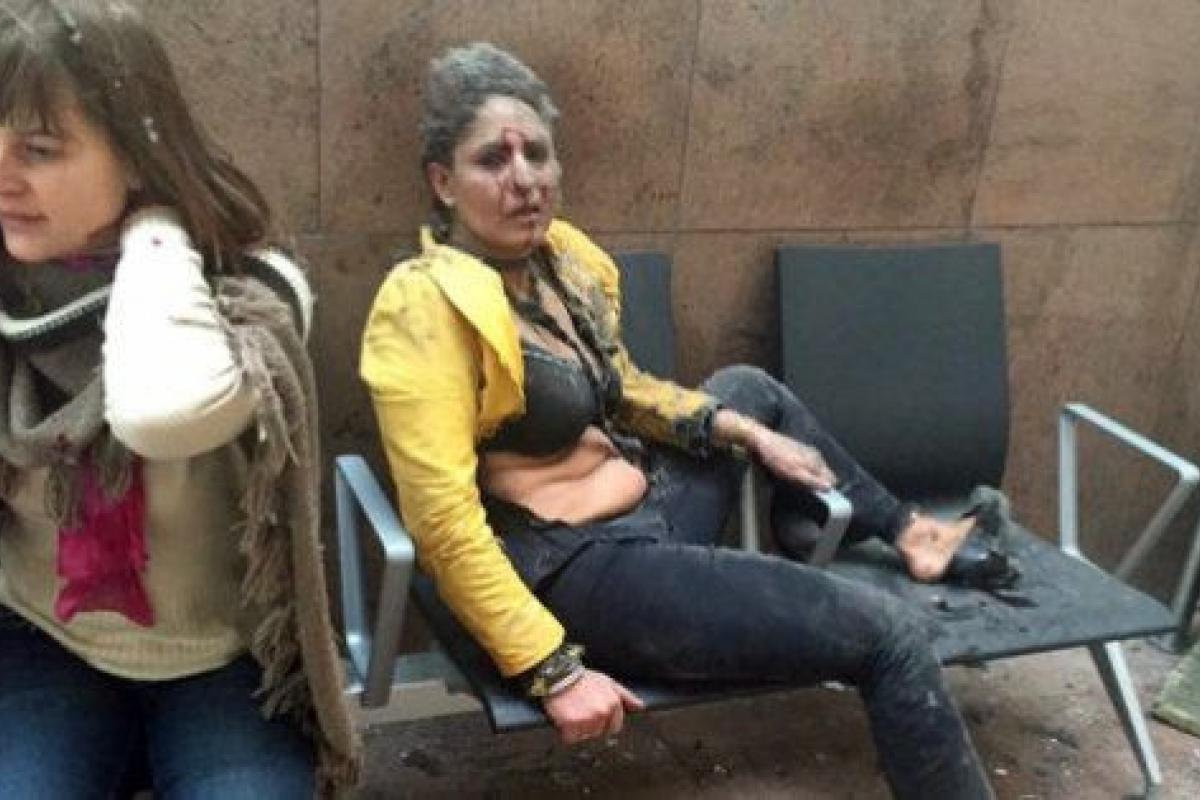 Es una foto fuerte. De las que remueven. Refleja el horror. El terror. La masacre. Dos mujeres cubiertas de sangre, de polvo. Una habla por teléfono, su mano ensangrentada. La otra mira a cámara, semidesnuda por los efectos de la explosión. Ha perdido un zapato y se aferra a uno de los sillones del hall del aeropuerto de Bruselas.
