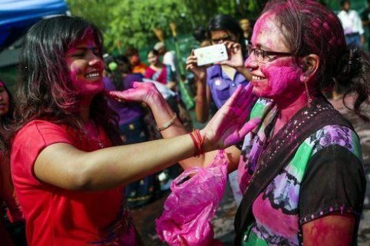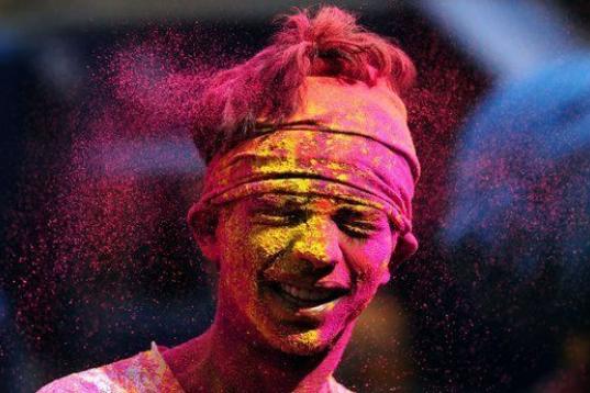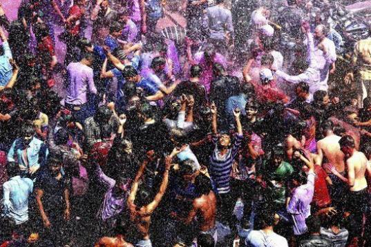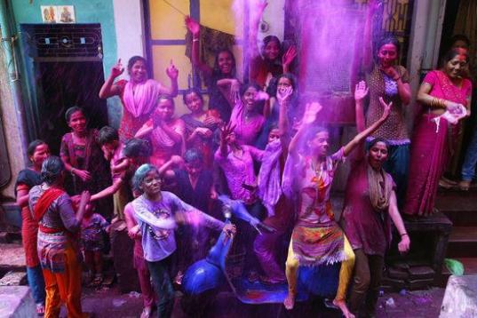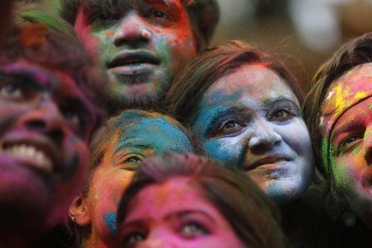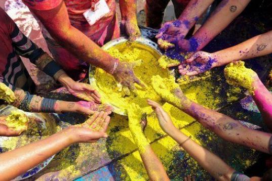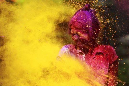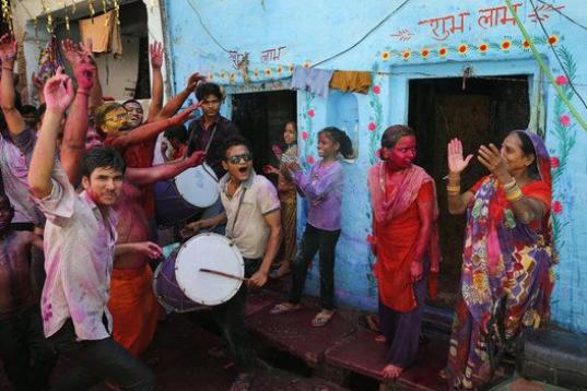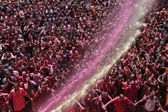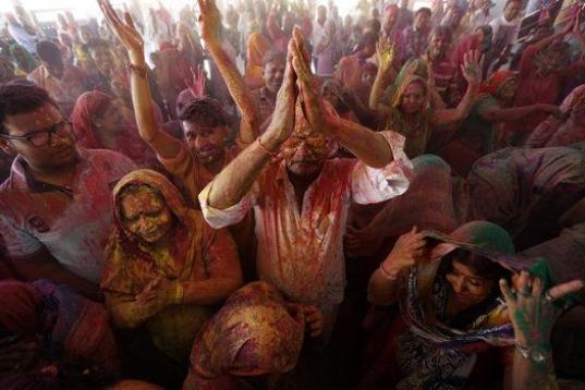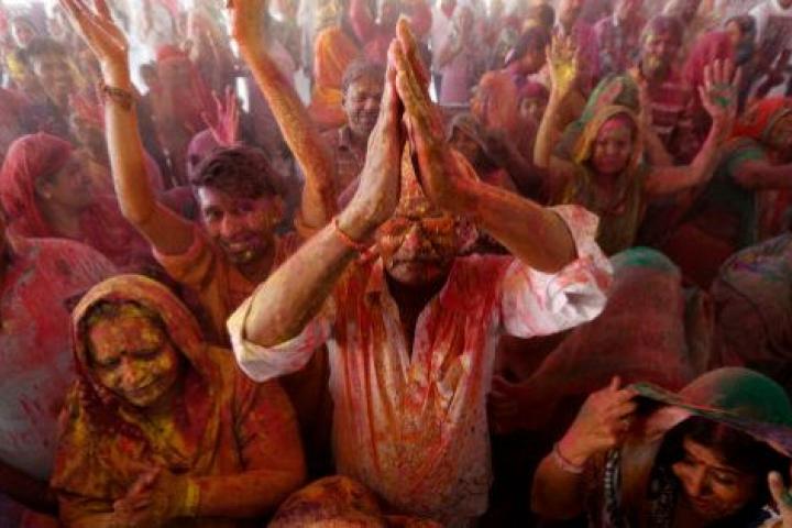 Oleadas de seguidores de Krishna, la encarnación divina del gozo y del amor, siguen la tradición y penetran de manera ininterrumpida en el Bankey Bihari, el principal templo dedicado a la deidad en Vrindavan (norte), para rendirle pleitesía con cantos, rezos y mucho 'gulal' o polvos de colores. Como en un campo de batalla, los fieles lanzan puñados de 'gulal' que estallan en el aire en dirección a la estatua de Krishna situada en un pequeño altar, y que es escoltada por varios sacerdotes, que responden arrojando a los feligreses agua tintada de rojo.