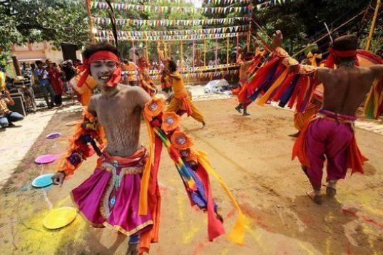 El colorido festival de Holi que se celebra este jueves en la India tiene uno de sus orígenes en una travesura del dios Krishna en el pueblo de Vrindavan, donde miles de devotos le replican ahora con un bombardeo de polvos de colores.