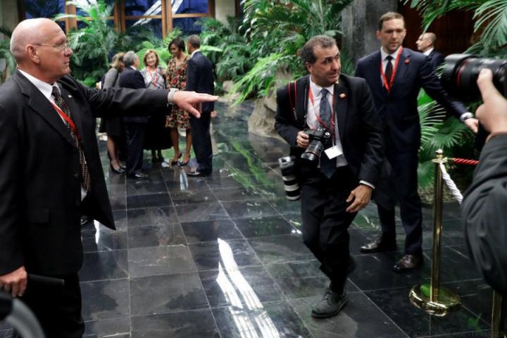 Las fuerzas de seguridad cubanas colocan a los fotógrafos, entre los que se encuentra el fotógrafo oficial de la Casa Blanca, Pete Souza, durante la visita del presidente de Estados Unidos, Barack Obama, a Cuba.
