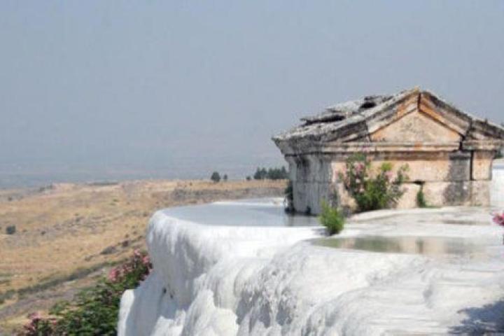De nuevo en Turquía, Pamukkale es también conocida como "el castillo de algodón" por su inmaculado color blanco, debido a las grandes cantidades de bicarbonato y calcio que contiene el agua de la zona. Antiguamente se hallaba en lo alto una c...