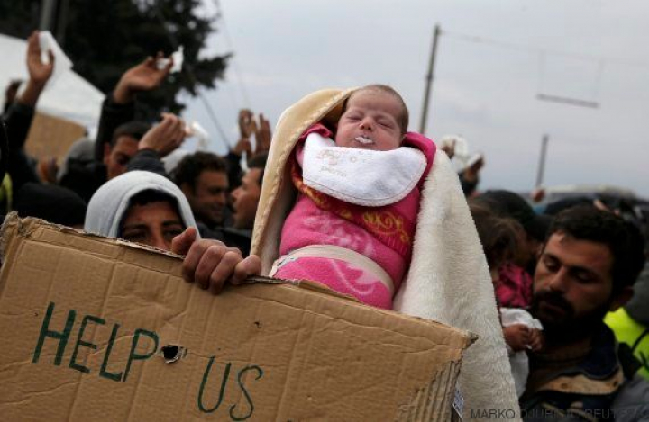 Un refugiado muestra a su bebé, junto a un cartel que reza "Ayudadnos".