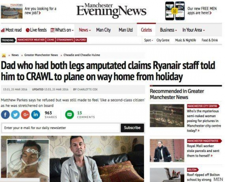Matthew Parkes, un británico de 38 años, es quien ha denunciado al Manchester Evening News el trato recibido cuando intentaba volver de vacaciones, de Málaga a Manchester. Según su relato, el personal de la compañía en la ciudad española le dijo que no podía ir en la silla de ruedas que usa por tener las dos piernas amputadas, así que debía "arrastrarse" a lo largo de dos rampas, una tanda de escaleras y, finalmente, la pista de despegue, hasta llegar al avión.