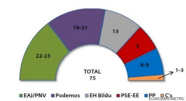 Ahora, parece que Podemos se ha estabilizado ya que, según el último Euskobarómetro, sería la segunda fuerza política de celebrarse elecciones con entre 19 y 21 escaños, por detrás del PNV, que lograría entre 22 y 23, y superando a Bildu, que se quedaría con 13.