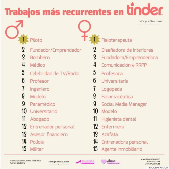 Esta red social para buscar pareja —o lo que surja— ha recopilado en su blog cuáles son los trabajos (verdaderos o fingidos) que más triunfan. Los que más right-swipe consiguen en Estados Unidos (los perfiles que más veces son deslizados hacia la derecha, lo que en el manejo de esta app quiere decir que gusta) son piloto, emprendedor y bombero en el caso de los chicos y fisioterapeuta, diseñadora de interiores y emprendedora en el de las chicas.