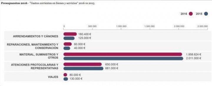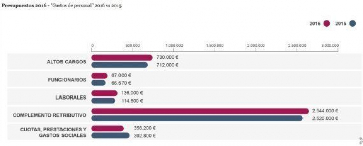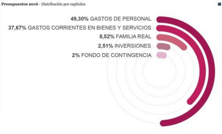 El desglose de los presupuestos de la Casa para 2016 es similar al del año anterior en todos los capítulos y, así, la partida más destacada es la de gastos de personal, con 3,83 millones de euros, seguida de gastos corrientes en bienes y servicios (casi 2,93 millones), Familia Real (662.316 euros), inversiones reales (195.000 euros) y fondo de contingencia (155.500 euros).