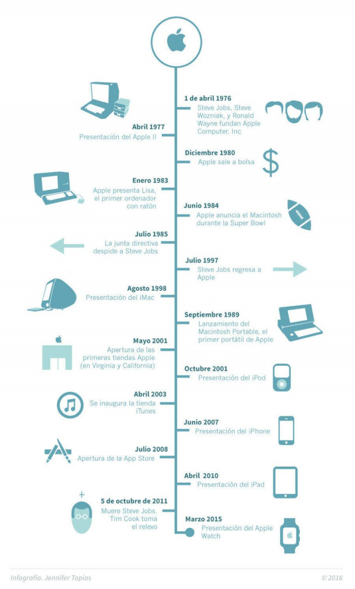 En la siguiente infografía puedes repasar de un vistazo cuáles han sido los principales hitos de la compañía desde su creación, pasando por sus innovaciones clave, la marcha (y posterior regreso) de Steve Jobs o su última apuesta: el Apple Watch.